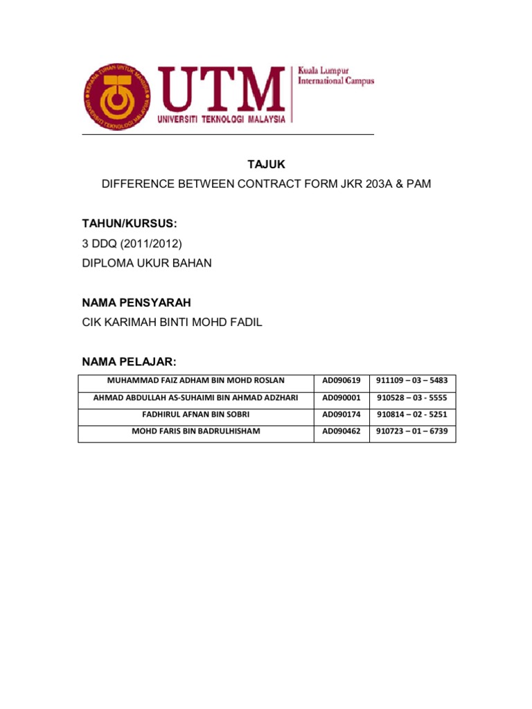 An overview of comparison between construction contracts in malaysia: These are the traditional forms of contract based on drawings and specification (203) or bills of quantities (203a) produced for use in public sector or government projects in both building and civil engineering en gineering contracts. Compare these three standard forms by analyzing the relevant clauses found in these standard forms on the following issues: Different between pam 2006 and pwd 203 bgee lee different between pam 2006 and pwd 203 by bgee lee pam 2006 (with qty) pam 2006 (with qty) quadrotary pam 2006. Comparison between pam 2006 and pwd 203a pwd form 203a rev 2007 bahasa melayu borang jkr 203a semakan 10 83 borang kontrak jkr 203a superintending officer representative malaysian government procurement pwd 203a bahasa melayu pwd form 203a rev 2007.