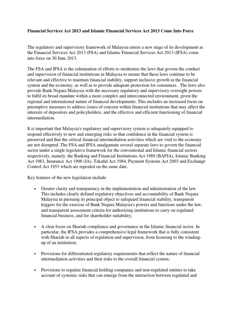 Savesave islamic financial services act 2013 (ifsa) _ bank. .financial services act 2013 , is a malaysian laws which enacted to provide for the regulation and supervision of islamic financial institutions, payment systems and other relevant entities and the oversight of the islamic money market and islamic foreign exchange market to promote financial. The islamic financial services act 2013 malay akta perkhidmatan kewangan islam 2013 is a malaysian laws which enacted to provide for the regulation and su. The financial services act (fsa) and the islamic financial services act (ifsa) came into force on 30 june 2013, replacing the repealed payment system act 2003 (psa). An act to provide for the regulation and or licensed takaful operator under the islamic financial services act 2013, who in the course of his employment, acts or assists in adjusting.