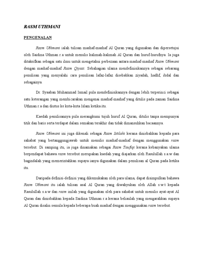 Ulama yang tidak mengakui rasm 'utsmani sebagai rasm tauqifi, berpendapat bahwa tidak ada masalah jika al qur'an ditulis dengan pola penulisan standar (rasm imla'i). Mushaf utsmani madinah dengan indonesitsmani hanya terbitan madinah* _banyak yang menganggap mushaf rasm utsmani. Tentara islam dari syam bergabung dengan pasukan dari irak. Tulisan arab nabi muhammad s.a.w. Kecuali pada beberapa kalimat dan kata yang sering digunakan dalam.
