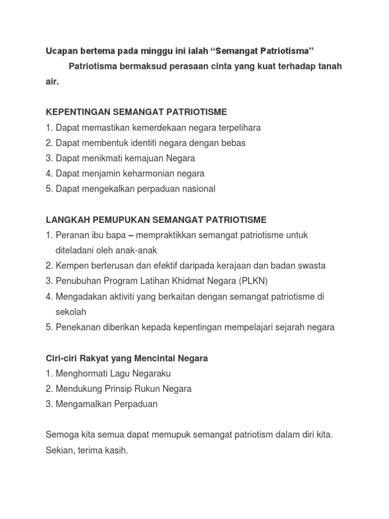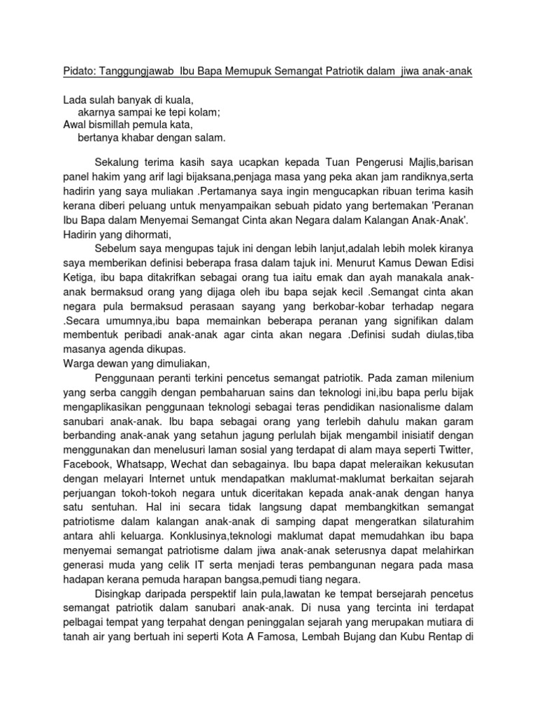 Punca Semangat Patriotisme Semakin Luntur Studocu from d20ohkaloyme4g.cloudfront.net Antara peranan ibu bapa dalam memupuk semangat patriotik dalam kalangan anak anak ialah menceritakan sejarah kemerdekaan tanah air kepada mereka. Peranan ibu bapa dalam memupuk semangat patriotik for more information and source, see on this link : Semangat ini mampu mempengaruhi masyarakat untuk mengutamakan kepentingan negara berbanding dengan kepentingan diri. Sejak dahulu lagi, pihak kerajaan, masyarakat, pihak sekolah dan ibu bapa telah menjalankan pelbagai langkah untuk memupuk semangat patriotisme dalam kalangan belia. Peribahasa melayu berkata bapa borek, anak rintik yang bermaksud sifat seseorang anak tidak jauh bezanya dengan sifat orang tuanya. For more information and source, see on this link : Lagu yang membuatkan kakpin teringat zaman sekolah dulu, waktu semangat membara mengibarkan bendara dengan penuh rasa bangga. Sebagai menggulung segala yang telah diperkataan di atas, ibu bapa perlu memainkan peranan dalam memupuk masyarakat yang mempunyai semangat cinta akan tanah air.